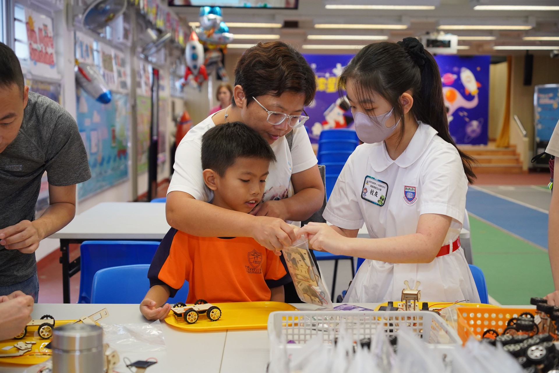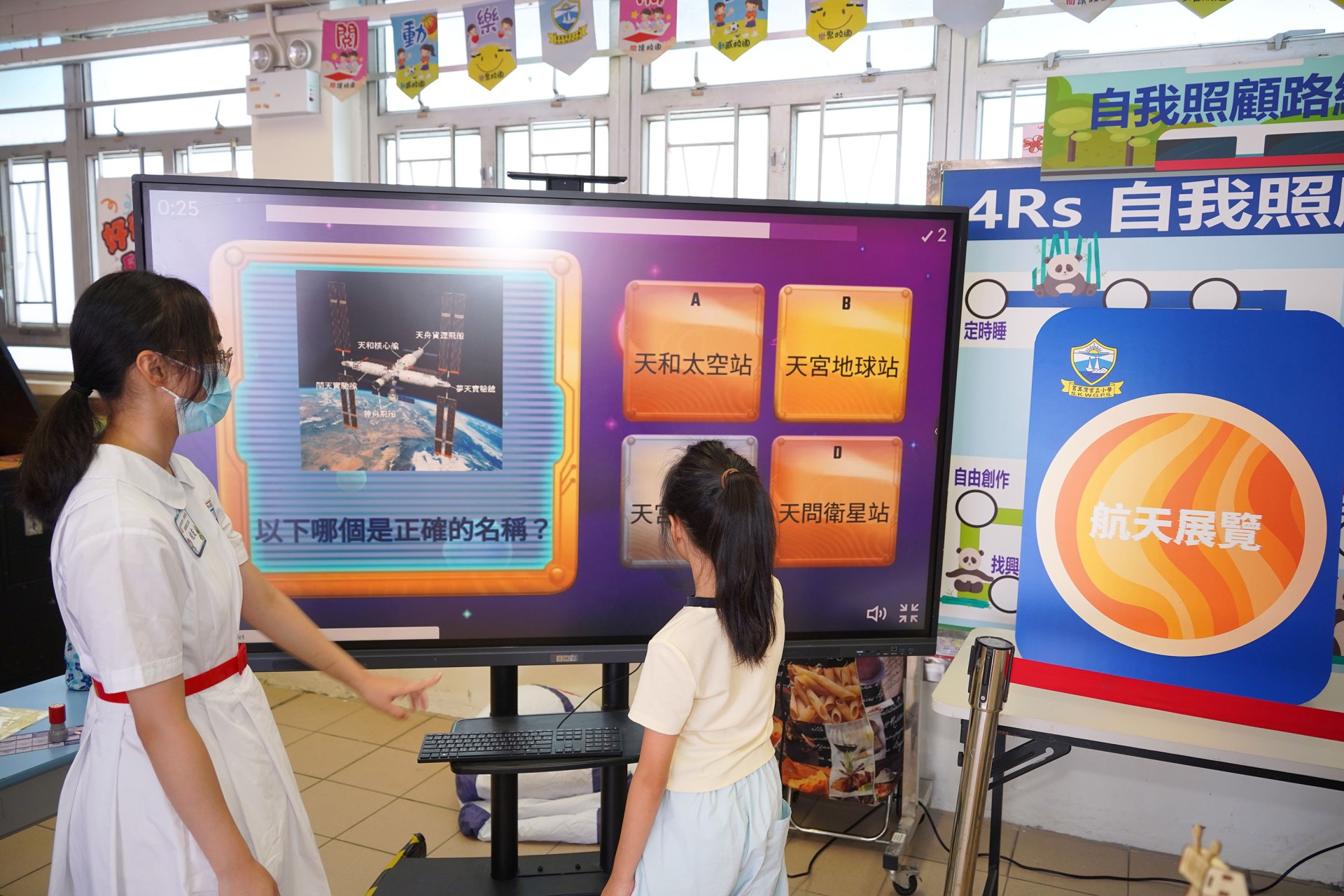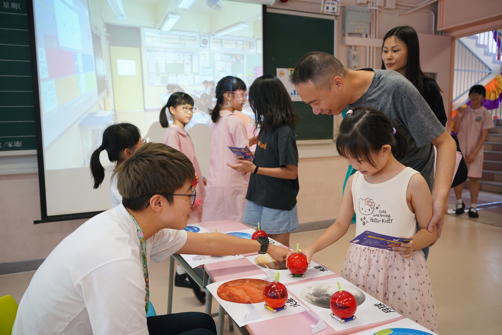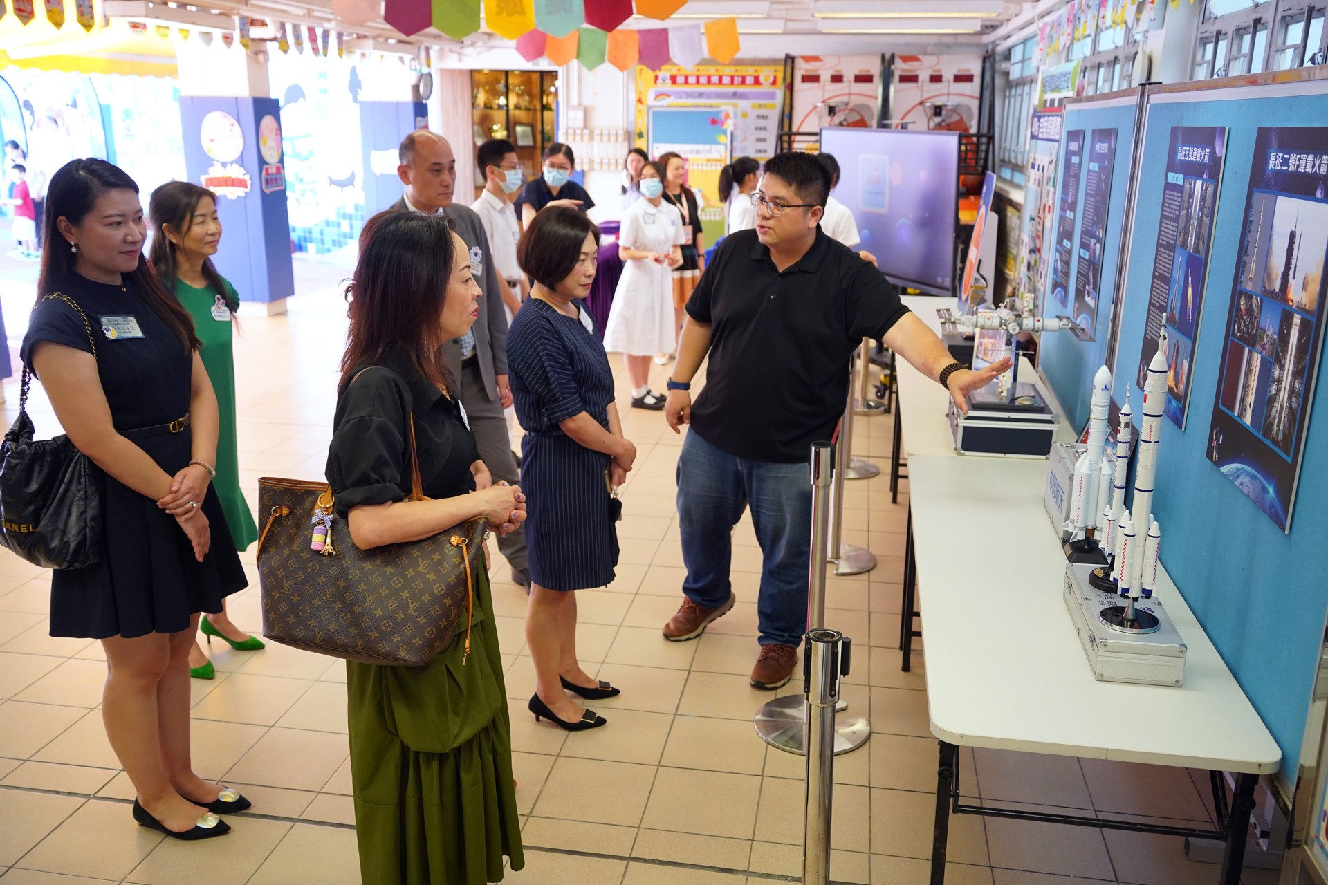 當天的航天體驗活動非常多元化,有動手製作的太陽能人造衞生及太陽能月球車工作坊;天宮空間站、北斗衞星、長征二號及五號火箭等的航天展覽;無人機火箭體驗活動;以天宮空間站實境設計,讓學生可以進行試驗,藉以理解無重狀態的VR太空艙體驗活動、航天服體驗等活動;此外,本校亦安排各科組以相同主題設計活動,例如數學科以不同星球的蘋果重量讓學生誘發學生對引力的興趣;又以太空故事作背景,讓學生以AI生成故事書等;將視藝元素結合STEM元素,製作動感火箭;以mbot讓學生體驗收集太空垃圾等,活動多元而緊扣課程,讓學生的學習變得更生動有趣。